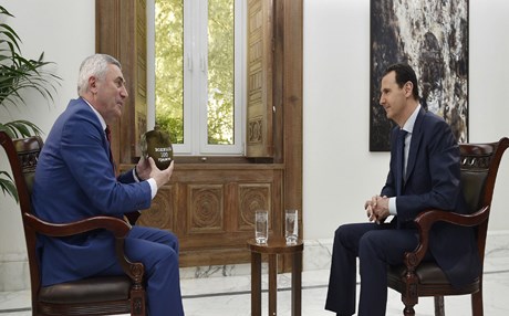 الأسد:لأن السياسة العالمية لا تحكمها المبادئ والأخلاق، وإنما تحكمها المصالح حتى لو كانت على حساب الأخلاق، وفي أغلب الأحيان هي على حساب المبادئ والقانون الدولي وغيرها، فاليوم هناك مجموعة من الدول هي دول استعمارية لا تحكمها المبادئ نهائياً، وهناك جزء كبير من الدول تعرف الحقيقة على المستوى الرسمي والشعبي ولكنها لا تجرؤ على أن تقول هذه الحقيقة خوفاً من الغرب، وهناك مجموعة من الدول القليلة تقول الحقيقة كما هي وتأخذ موقفا مبدئياً وأخلاقياً، منها دولتكم بيلاروس، منها روسيا، منها إيران، منها كوريا الديمقراطية، طبعاً هذه الدول لأنها لا تسير مع الغرب هي دول إما تسمى محور الشر أو دولاً غير ديمقراطية، أو كما تحدثت قبل قليل توصف بمواصفات غير جيدة؟ لكن هذه الدول هي الوحيدة، أو من الدول القليلة على مستوى العالم التي تجرؤ على قول الحقيقة، هذا هو السبب في أنك لا تسمع سوى القليل عن مجموعات بمئات الآلاف من الأبرياء محاصرين في مكان ما ولا أحد يتحدث عنهم، بالمقابل عندما يقوم الإرهابيون في حلب باختطاف جزء من المدينة مع شعبها ويقومون بقتل الجزء الآخر بالقذائف بشكل يومي لا أحد يذكر هذا الموضوع، لا يعنيهم هذا الشيء، هم يدافعون عن الإرهابيين، وعندما نقوم بتحرير هذه المدينة من الإرهابيين يصبح هناك خرق لحقوق الإنسان لأن الحقوق والإنسان بالنسبة لهم هو الإرهابي، وكل من هو غير إرهابي غير موجود على الخارطة بالنسبة لهم، لا السياسية ولا الإنسانية.