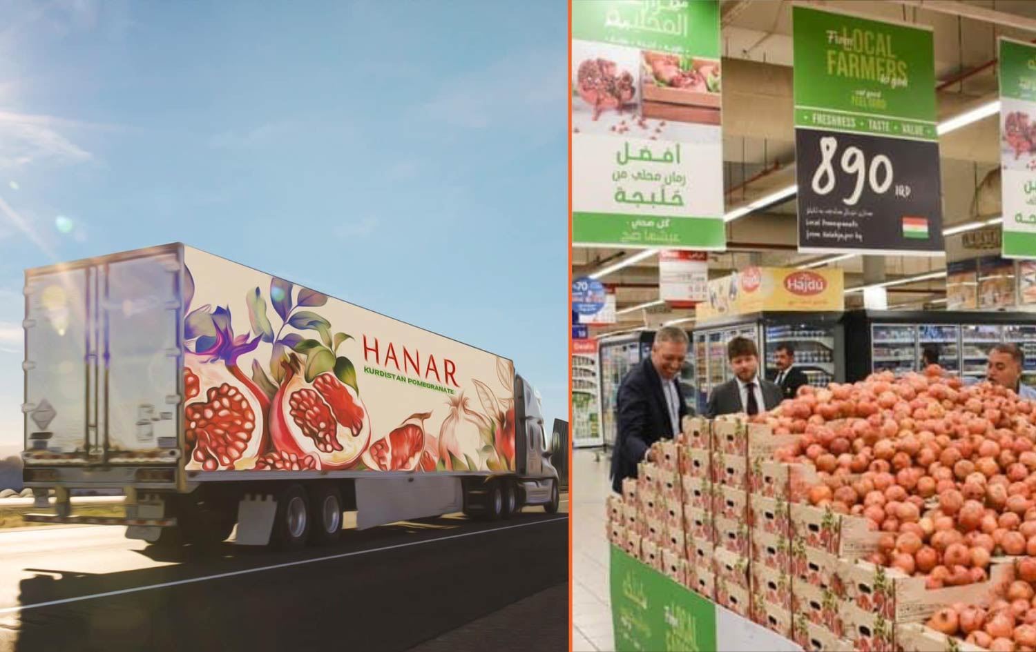 رئيس حكومة إقليم كوردستان، مسرور بارزاني، نشر أمس، صورة لشاحنة تحمل صورة الرمان كتب عليها "رمان كوردستان" مرفقاً ذلك بتعليق "نفذنا وعدنا"، في إشارة إلى الرمان الذي سيتم تصديره من محافظة حلبجة.
