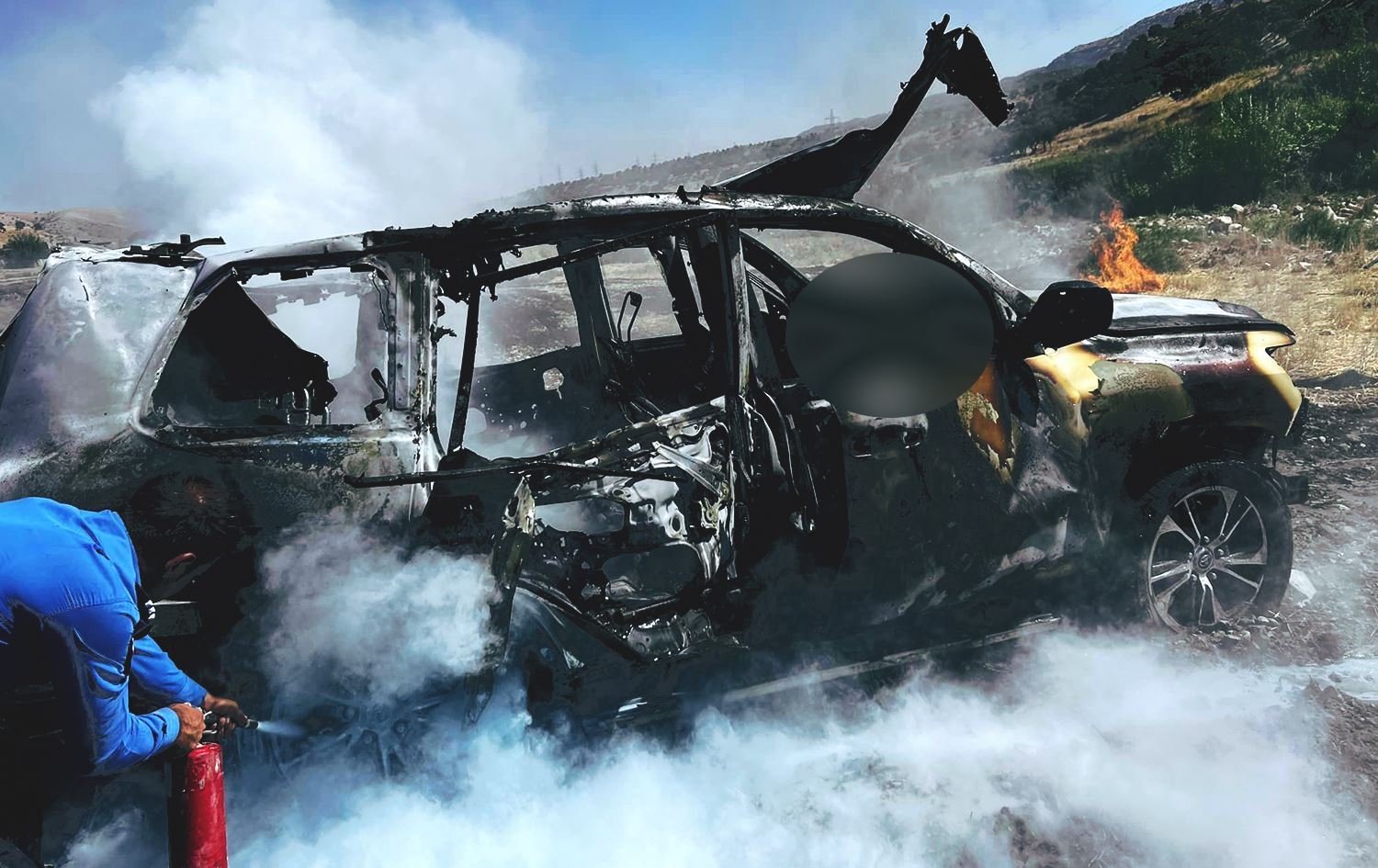 أحد الشهود كان في موقع الحادث وصور السيارة وبعث بمقطع فيديو لرووداو تظهر فيه السيارة تشتعل بالكامل والأهالي يحاولون إطفائها