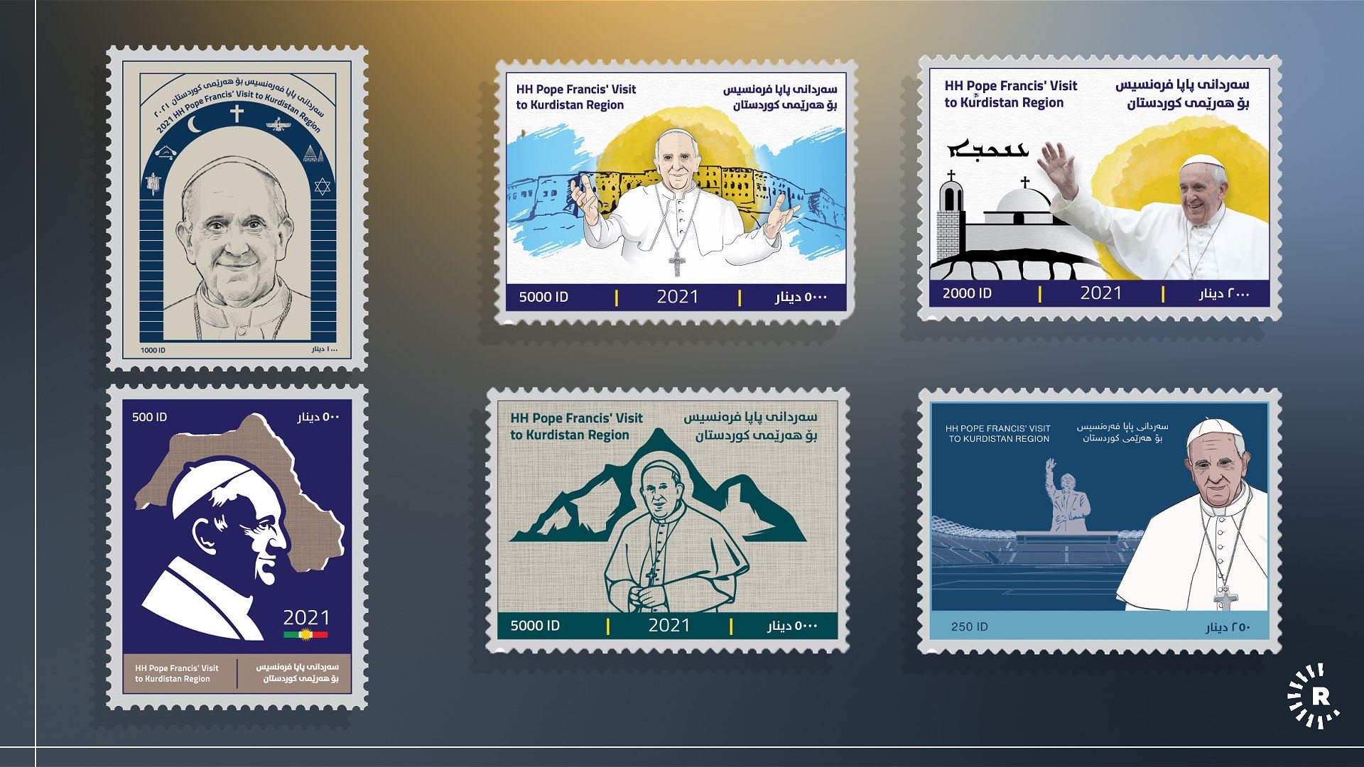 أصدرت حكومة إقليم كوردستان، العديد من الطوابع البريدية بمناسبة زيارة بابا الفاتيكان، البابا فرنسيس، إلى إقليم كوردستان.