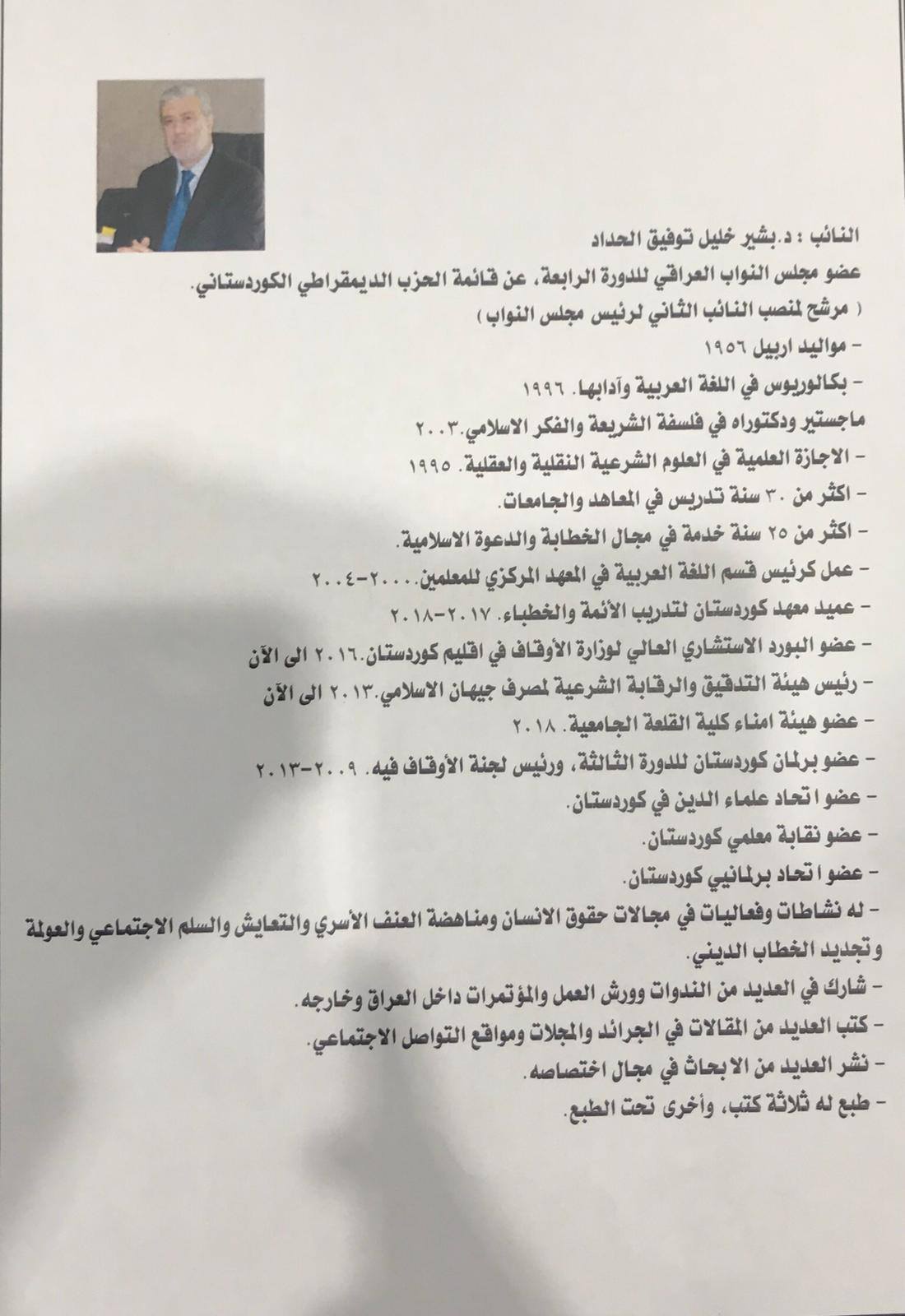 صوت مجلس النواب العراقي، اليوم الأحد، لاختيار بشير الحداد نائباً ثانياً لرئيس البرلمان العراقي. وحصل الحداد على 185 صوتاً، بعد اجراء عملية التصويت السري. وأدناه السيرة الذاتية للنائب الثاني لرئيس البرلمان العراقي.