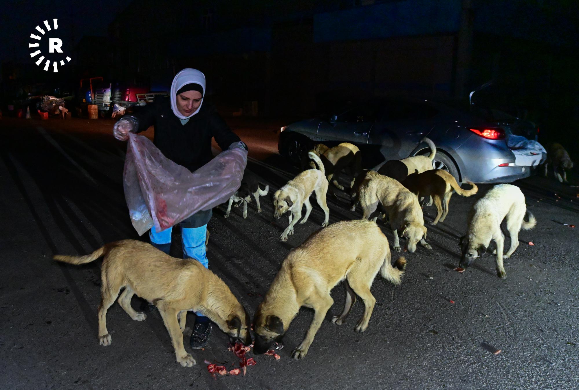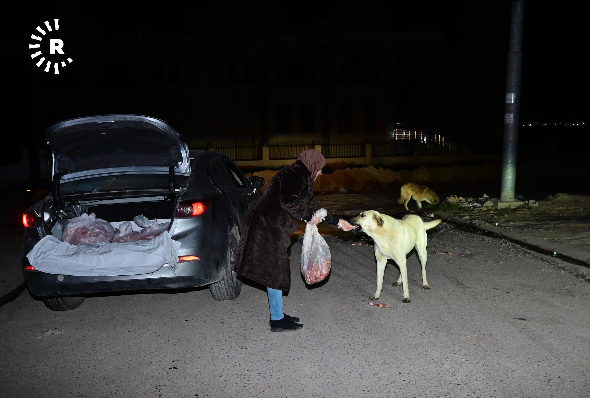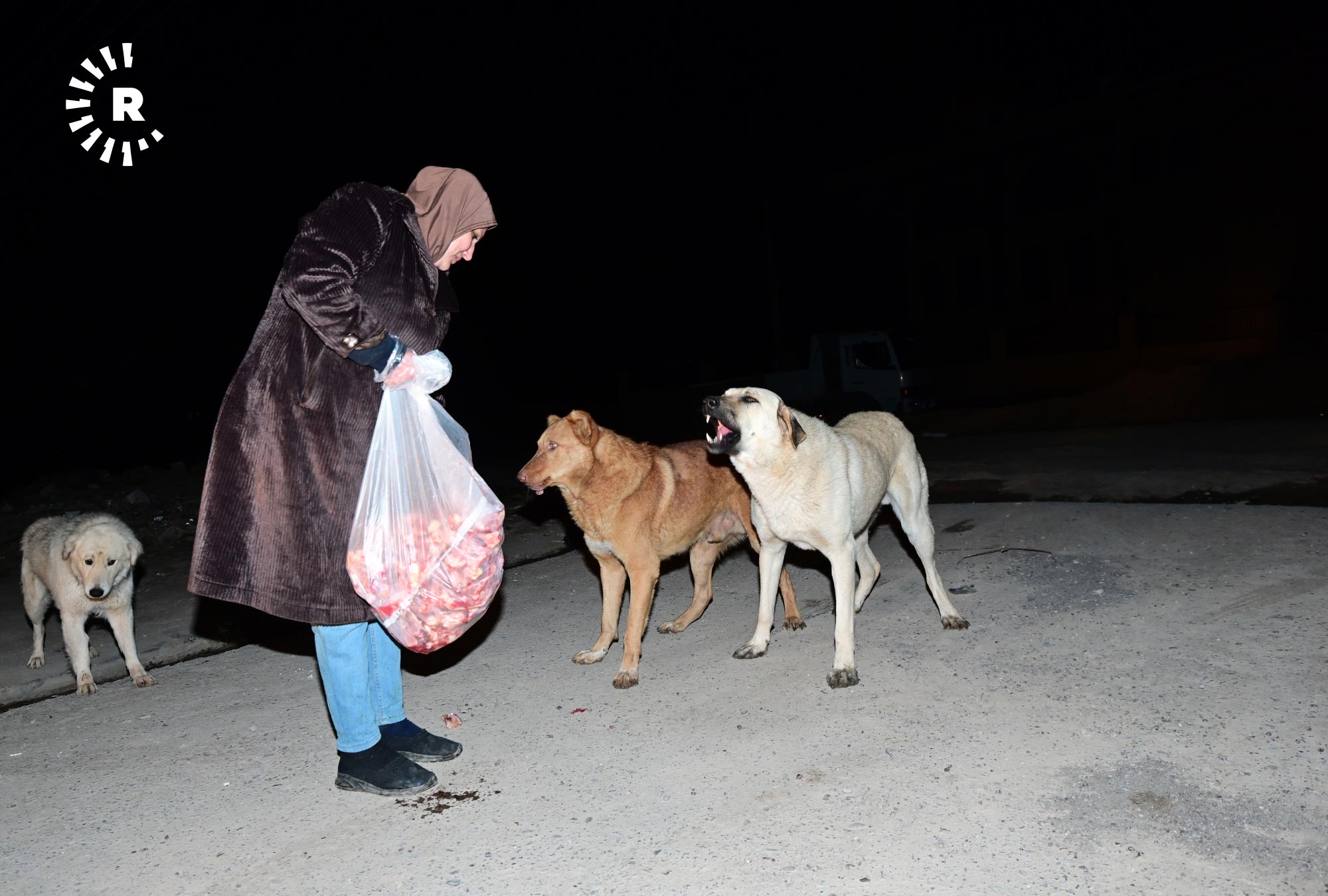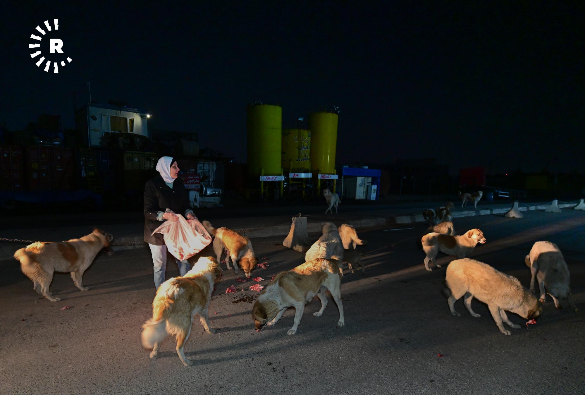 إنعام صابر، 49 عاماً، تقيم في أربيل منذ 2009، في حي هوليري نوي، تخرج كل ليلة في الساعة الثانية بعد منتصف الليل بسيارتها باحثة عن الكلاب السائبة لتوزع عليها بحلول الصبح أكثر من 120 كيلوغراماً من الطعام.