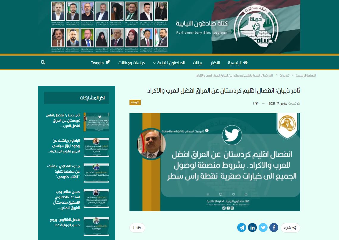 نفى المكتب الإعلامي للنائب عن كتلة صادقون، ثامر ذيبان الحمداني، اليوم الأربعاء، صحة تغريدة نسبت إليه دعت إلى انفصال إقليم كوردستان، في الوقت الذي أكدت فيه الأمانة العامة للكتلة النيابية صدور التغريدة عن النائب.