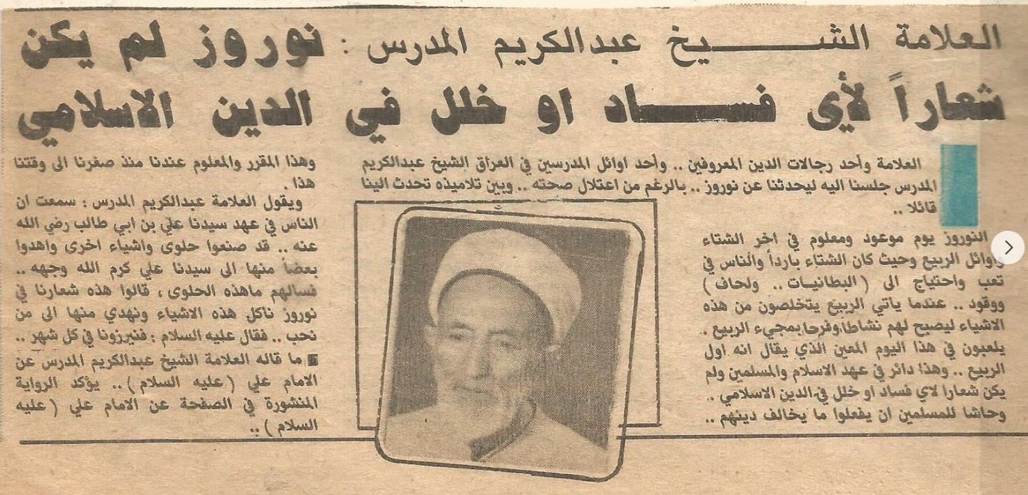 ونشرت الصحيفة حديث المدرّس تحت عنوان: "العلامة الشيخ عبد الكريم المدرّس: نوروز لم يكن شعاراً لأي فساد أو خلل في الدين الإسلامي".