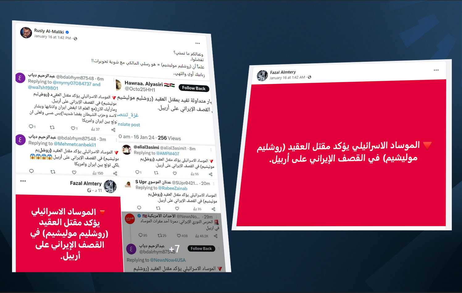 بعض الصفحات مثل (رسلي المالكي) أدعت أن "الموساد الإسرائيلي يؤكد مقتل العقيد (روشليم موليشيم) في القصف الإيراني على أربيل" وجرى تداول هذا المنشور على صفحات موقع "إكس" وحظي بإشادات من روادها.