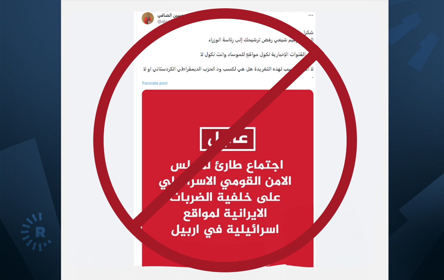الخبر المزيف تم تداوله على صفحات منصة "إكس" أيضاً، حتى أن قنوات على موقع تليغرام اعتمدته دليلاً على قصف موقع إسرائيلي في أربيل "فيما رئيس الوزراء يرفض ذلك".
