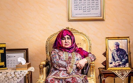على أريكة في زاوية غرفة واسعة، جلست امرأة ترتدي ثوباً مزخرفاً بألوان زاهية جلسة المترقِّب. ويظهر انعكاس الحجاب الأحمر الذي يغطي شعرها في خزانة ذات واجهة زجاجية، بداخلها، وضعت والدة أسامة بن لادن صورة لابنها البكر في إطار بمكانٍ بارز بين ممتلكات العائلة الموروثة وأشيائها الثمينة.