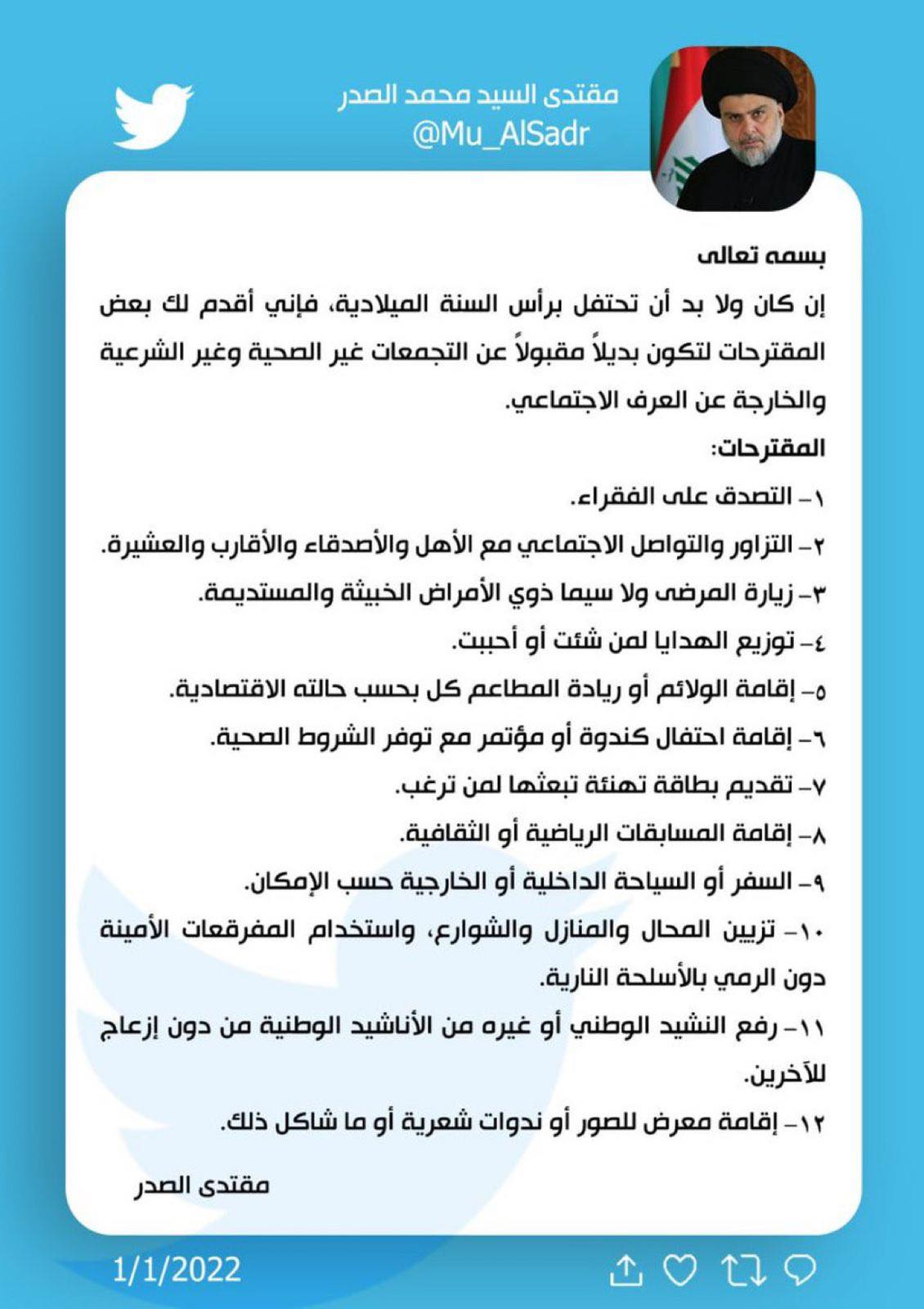 وجاء في تغريدة للصدر على منصة التواصل تويتر السبت، 01 كانون الثاني، 2022، ان "احد اسباب بدء الجائحة هي مثل هذه التجمعات الخارجة عن نطاق الوقاية الشرعية والادبية، والاخلاقية، والاجتماعية".