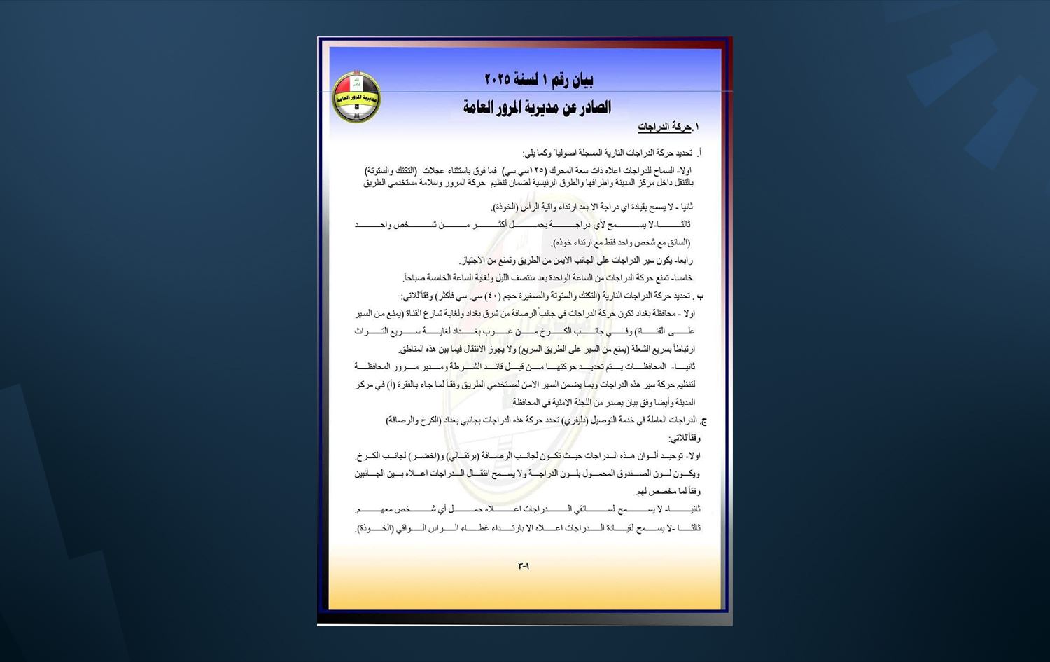 كما حدد البيان وجوب سير الدراجات على الجانب الأيمن من الطريق، ومنعها من الاجتياز.