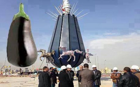 واصبح النصب الموجود قرب ساحة سعد في محافظة البصرة وهو عبارة عن نقطة نفط كبيرة وتدور حولها الخيول، موضع سخرية وتندر عند البصريين الذين اكد العديد منهم ان هذا النصب يذكرهم بأيام الحصار بعد ان اصبح الباذنجان سيد المائدة في تلك الأيام، ليتحول نصب الحرية في البصرة الى نصب "الباذنجانة".