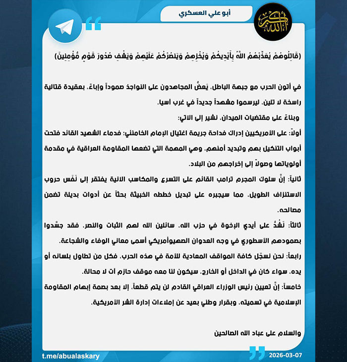 يوم السبت (7 آذار 2026) نشر أبو علي العسكري بياناً عبر حسابه الرسمي على منصة تلغرام، جاء فيه: "على الأميركيين أن يفهموا أن دماء الإمام الخامنئي قد فتحت أبواب تأديبهم وزعزعة أمنهم، والمهمة ذات الأولوية للمقاومة العراقية هي إخراجهم من البلاد".