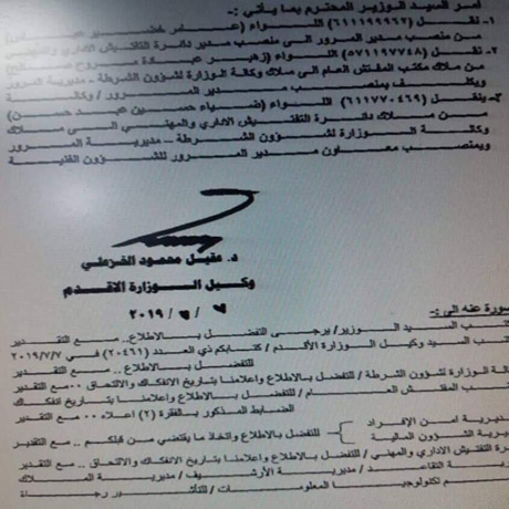 وبحسب وثيقة وردت لشبكة رووداو الإعلامية، تكشف عن أوامر صادرة عن وزير الداخلية ياسين الياسري تقضي بإقالة مدير المرور العام اللواء عامر العزاوي من منصبه؛ وتكليف اللواء زهير عبادة بدلاً عنه بالوكالة.