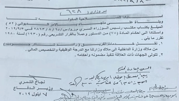 وبحسب الوثيقة الصادرة من وزارة الدفاع وتلقت شبكة رووداو الإعلامية، نسخة منها إنه "استناداً للصلاحيات المخولة لنا وبناءً على ما جاء بكتاب مكتب رئيس الوزراء السري، واستناداً الى احكام المادة 78 من الدستور، تقرر نقل خدمات الفريق رائد شاكر جودت من ملاك وزارة الداخلية الى ملاك وزارتنا مع الدرجة الوظيفية والتخصيص المالي، على ان تتولى الجهات ذات العلاقة تنفيذ مضمونه واحكامه".