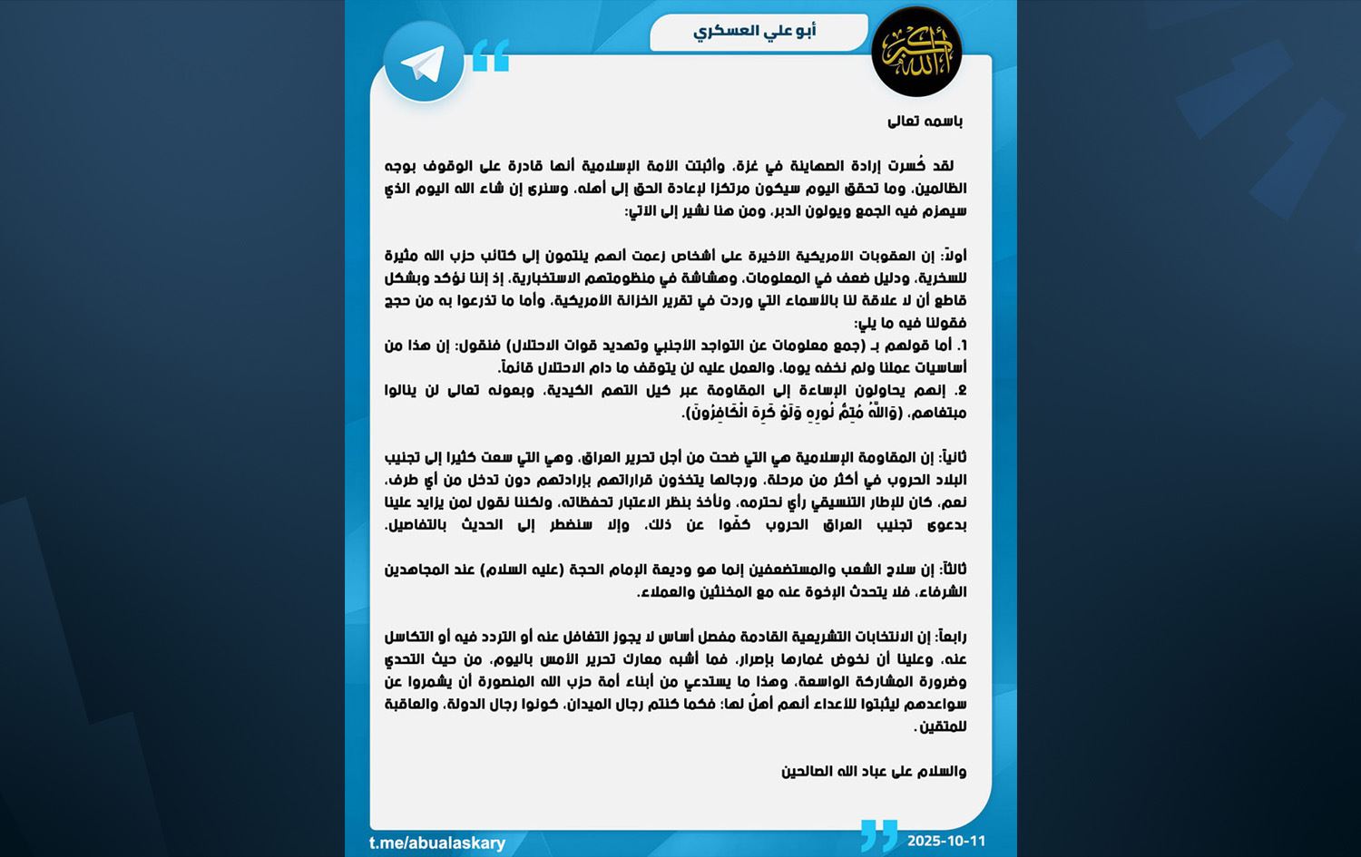 وأكد أبو علي العسكري، في بيان اليوم السبت (11 تشرين الأول 2025)، "بشكل قاطع" أن لا علاقة للكتائب بالأسماء التي وردت في تقرير الخزانة الأميركية.