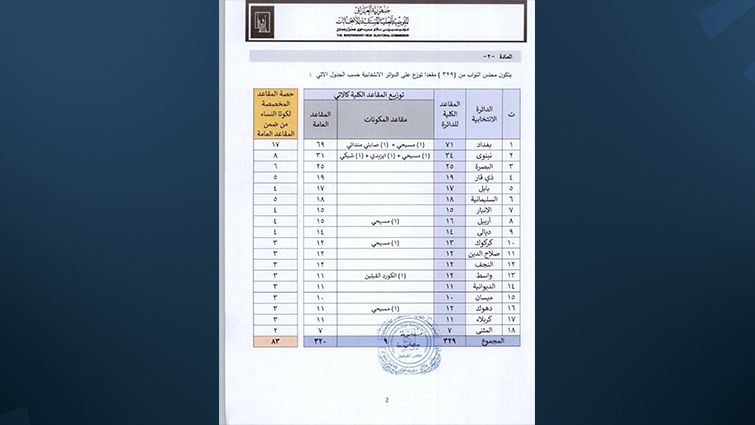 يشار الى أن المفوضية العليا للانتخابات العراقية، أعلنت يوم الأربعاء الماضي، النتائج الأولية للانتخابات البرلمانية، التي شهدت إقبالاً بنسبة 56.11% لاختيار 329 نائباً.