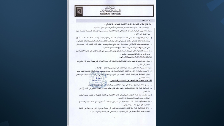 عدد مقاعد القائمة يقسم على عدد 4، مع إهمال الكسور العشرية لاستخراج عدد مقاعد كوتا النساء فيها، وفي حال عدم استكمال مقاعد النساء في القائمة وفق هذا التقسيم، يجري تقسيم عدد مقاعدها على عدد 3، وفقاً للمفوضية.