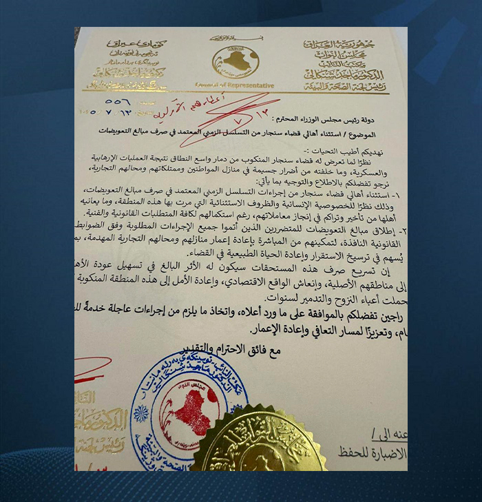 يذكر أنه في حزيران الماضي، طالبت لجنة الهجرة والمصالحة المجتمعية النيابية، الجهات المعنية بصرف التعويضات المالية للنازحين من أهالي سنجار، مشيرة إلى أنهم لم يتسلّموا أية مستحقات حتى الآن.