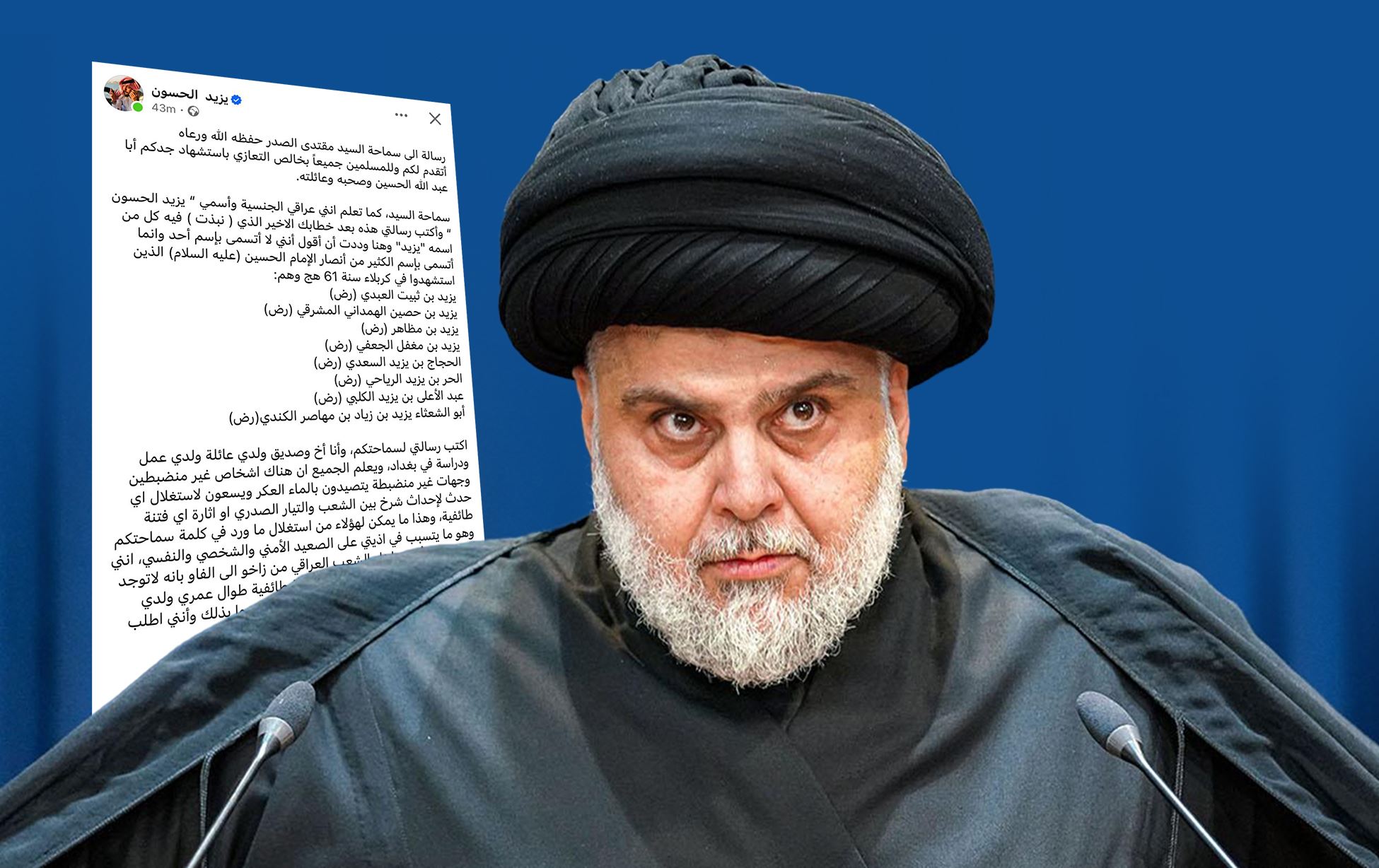 في حادثة غريبة، أطلق زعيم التيار الوطني الشيعي مقتدى الصدر، اسماً جديداً على مواطن عراقي من محافظة صلاح الدين يدعى "يزيد الحسون"، بعد أن ناشد الأخير الصدر برسالة.
