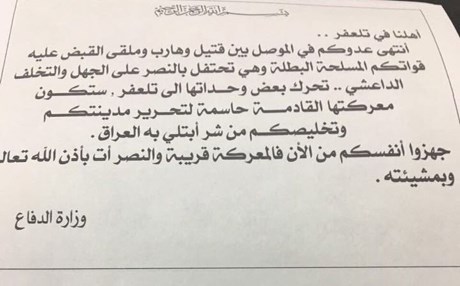 وجاء في منشورة الخلية: "عدوكم انتهى في الموصل بين قتيل وهارب وملقى عليه، وان القوات المسلحة وهي تحتفل بالنصر على الجهل والتخلف الداعشي، تحرك بعض وحاتها الى تلعفر".