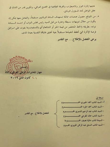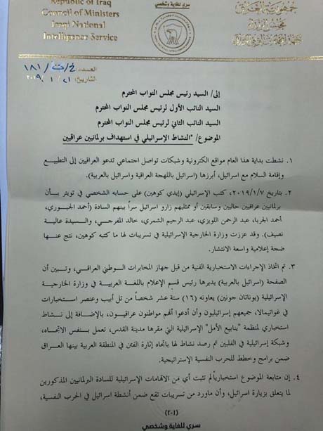 وجاء في وثيقة للجهاز المرسل إلى رئاسة مجلس النواب: "نشطت بداية هذا العام مواقع إلكترونية وشبكات تواصل اجتماعي تدعو العراقيين إلى التطبيع وإقامة السلام مع اسرائيل، أبرزها (اسرائيل باللهجة العراقية واسرائيل بالعربية) ، حيث بتاریخ 7/1/2019 کتب الإسرائيلي (إيدي كوهين) على حسابه الشخصي في تويتر بأن برلمانيين عراقيين حاليين وسابقين أو ممثليهم زاروا إسرائیل سراً بينهم (أحمد الجبوري أحمد الجربا، عبد الرحمن اللويزي، عبد الرحيم الشمري، خالد المفرجي، وعالية نصيف) ، وقد عززت وزارة الخارجية الإسرائيلية في تسريبات لها ما كتبه كوهين، نتج عنها ضجة إعلامية واسعة الانتشار".