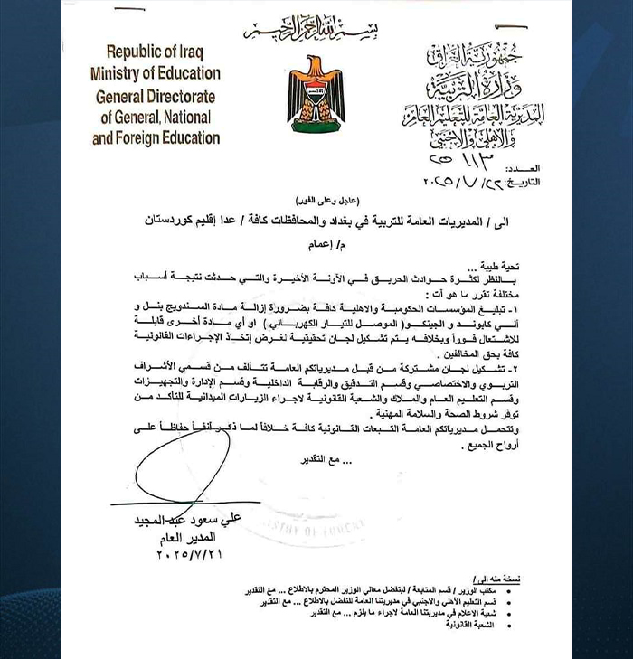 أصدرت وزارة التربية العراقية، تعميماً موجهاً إلى المديريات العامة للتربية في بغداد والمحافظات كافة باستثناء إقليم كوردستان، يتضمن إجراءات عاجلة للحد من أسباب الحرائق في المؤسسات التعليمية.