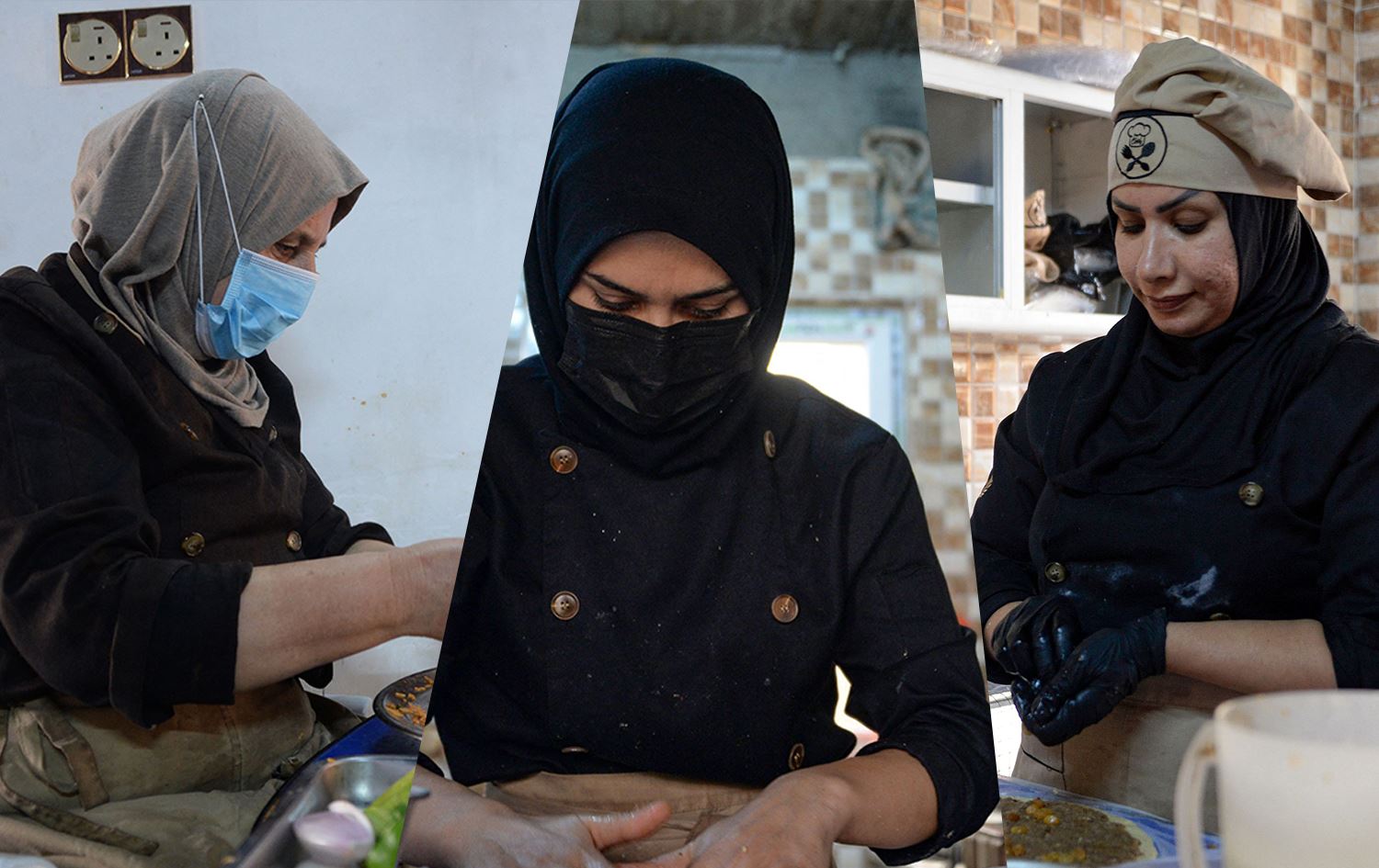 تنهمك عبير جاسم في حشو الخضار في إطار عملها كطاهية ضمن فريق من النساء حصرا في مشغل للأطباق التقليدية في الموصل والذي يؤمن الأمان المادي لها ولأطفالها الثلاثة اليتامى.