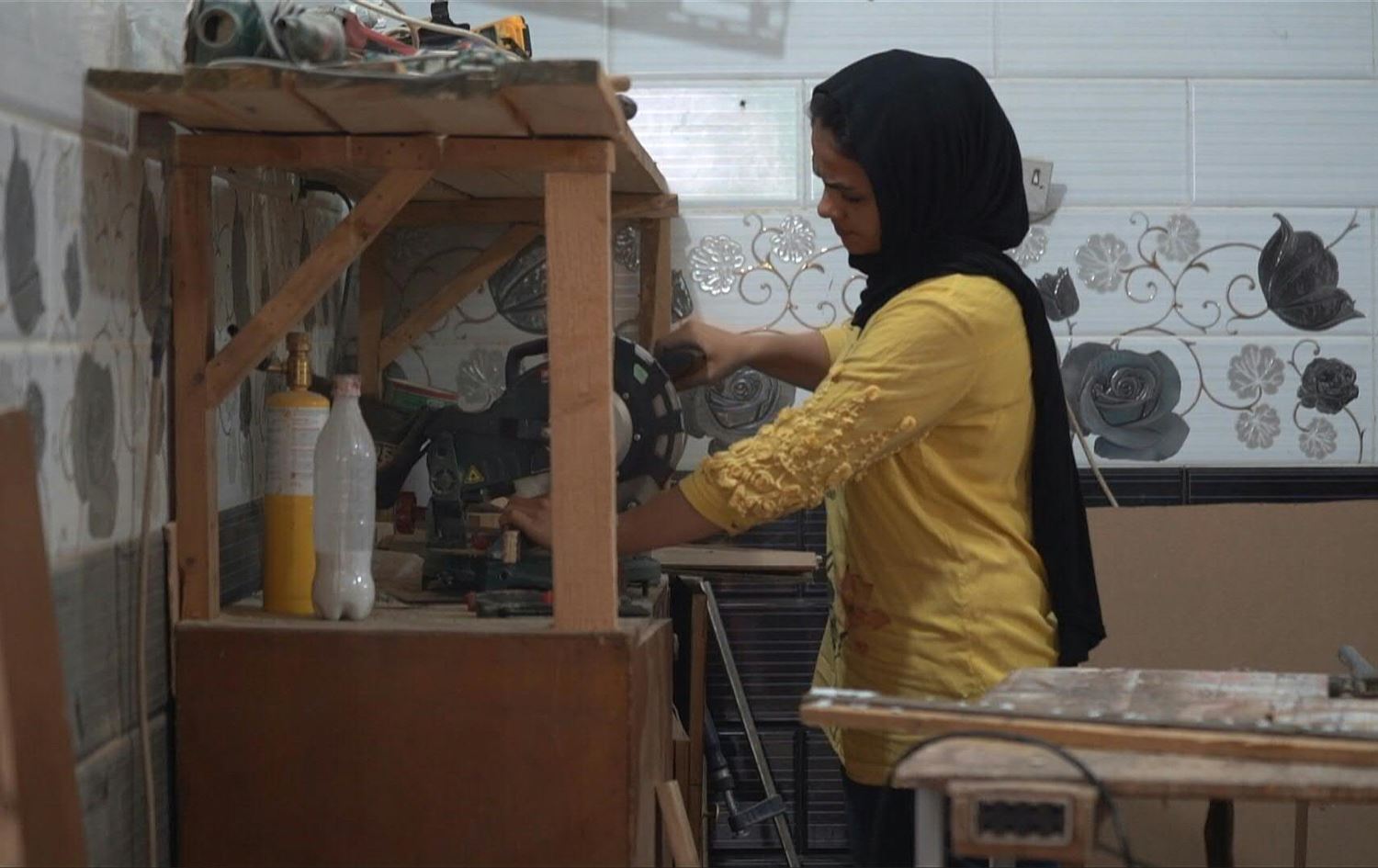 تتنقل نور الجنابي، وهي أم لأربعة أطفال، داخل ورشتها بين معدات نجارة، مناشير ومسامير وقطع خشبية، وتنهمك في صنع أريكة تغلفها بقماش وردي.