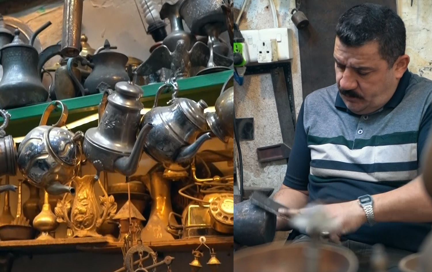 عندما تتجول في السوق لا تسمع غير صوت مطرقة نور الدين الذي يصنع القدور والصواني والمعالق ودلال القهوة والأباريق النحاسية.