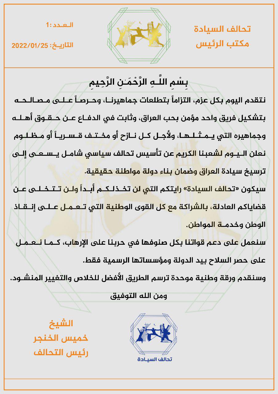 وقال الخنجر في بيان رسمي صادر عن التحالف الجديد، تلقت شبكة رووداو الإعلامية نسخة منه مساء اليوم الثلاثاء (25 كانون الثاني 2022)، إنه "نتقدم اليوم بكل عزم، التزاماً بتطلعات جماهيرنا، وحرصاً على مصالحه بتشكيل فريق واحد مؤمن بحب العراق، وثابت في الدفاع عن حقوق أهله وجماهيره التي يمثلها، ولأجل كل نازح أو مختف قسرياً أو مظلوم، نعلن اليوم لشعبنا الكريم تأسيس تحالف سياسي شامل يسعى الى ترسيخ سيادة العراق وضمان بناء دولة مواطنة حقيقية".