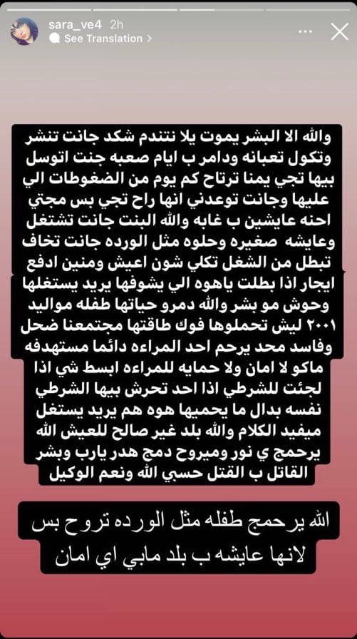 وأضافت، "نورزان ذات 20 عاماً لم ترى شيئا في حياتها بعد وانتهت قصتها بسبب اشخاص لايمكن القول عنهم انهم رجال ولكنهم وحوش بشرية متعطشة للدماء أتمنى من القضاء تطبيق أقسى العقوبات بحق كل متحرش ومغتصب وكل مجرم قاتل يتجول بين الناس ويظهر نفسه على انه ملاك".