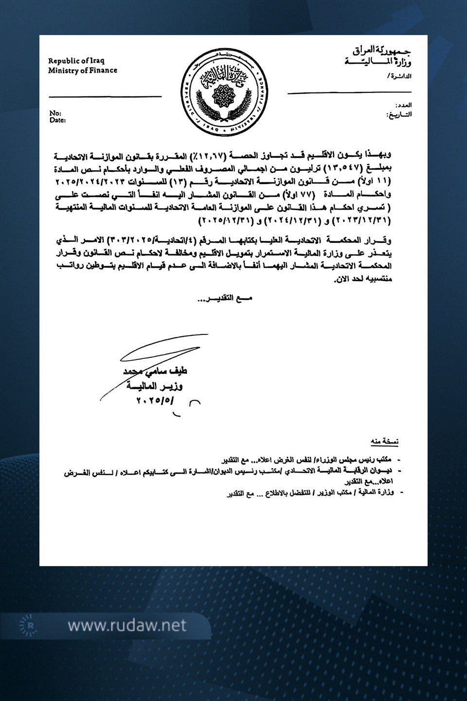 وجّهت وزيرة المالية العراقية، طيف سامي، كتاباً رسمياً إلى حكومة إقليم كوردستان، تُبلغها بموجبه بأن الوزارة "يتعذّر عليها" الاستمرار بتمويل إقليم كوردستان لـ"تجاوزه الحصة (12.67%) المقرّرة بقانون الموازنة الاتحادية، بمبلغ (13.547) تريليون دينار من إجمالي الصرف الفعلي".