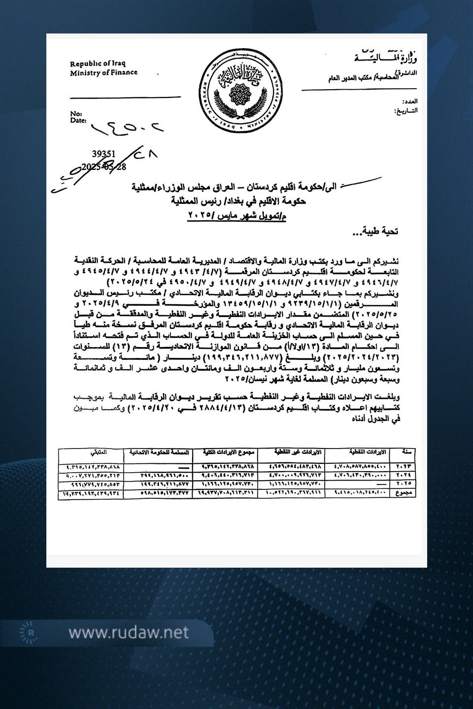 الكتاب الذي حمل توقيع طيف سامي أشار إلى أن مبلغ الإيرادات النفطية وغير النفطية لحكومة إقليم كوردستان التي سلّمت إلى الحكومة الاتحادية، خلال السنوات الثلاث، بلغ 598 ملياراً و515 مليوناً و173 ألفاً و377 ديناراً، والمتبقي هو 19 تريليوناً و239 ملياراً و193 مليوناً و439 ألفاً و934 ديناراً.