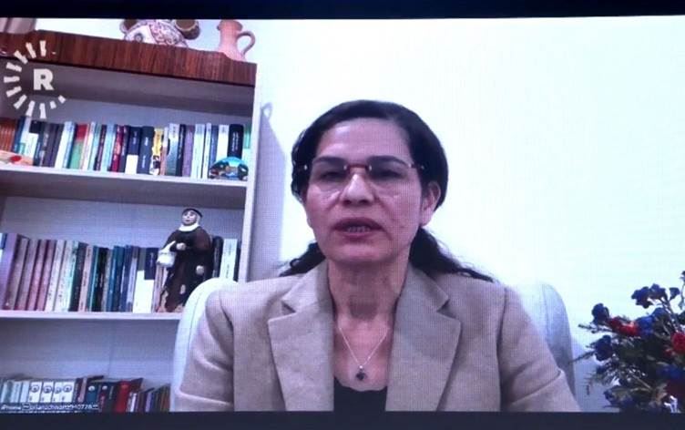 الرئيسة المشتركة لدائرة العلاقات الخارجية في الإدارة الذاتية لإقليم شمال وشرق سوريا، إلهام أحمد. الصورة: رووداو غرافيك