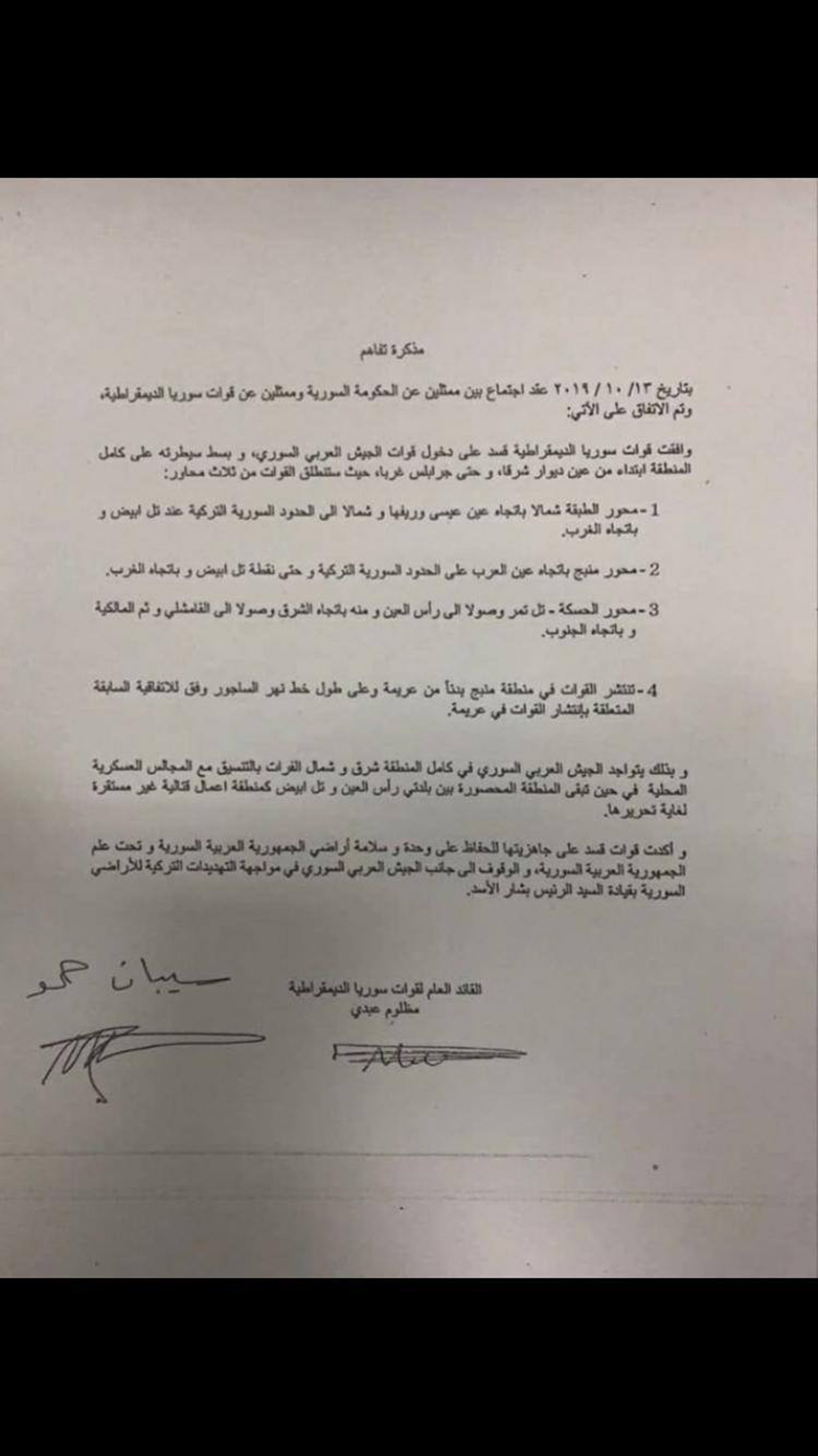 وجاء في "مذكرة التفاهم" التي حملت توقيع كل من القائد العام لقوات سوريا الديمقراطية، مظلوم عبدي، وقائد وحدات حماية الشعب الكوردية، سيبان حمو، أن "اجتماعاً عُقد بين ممثلين عن الحكومة السورية، وآخرين عن قوات سوريا الديمقراطية، يوم الأحد 13/10/2019".