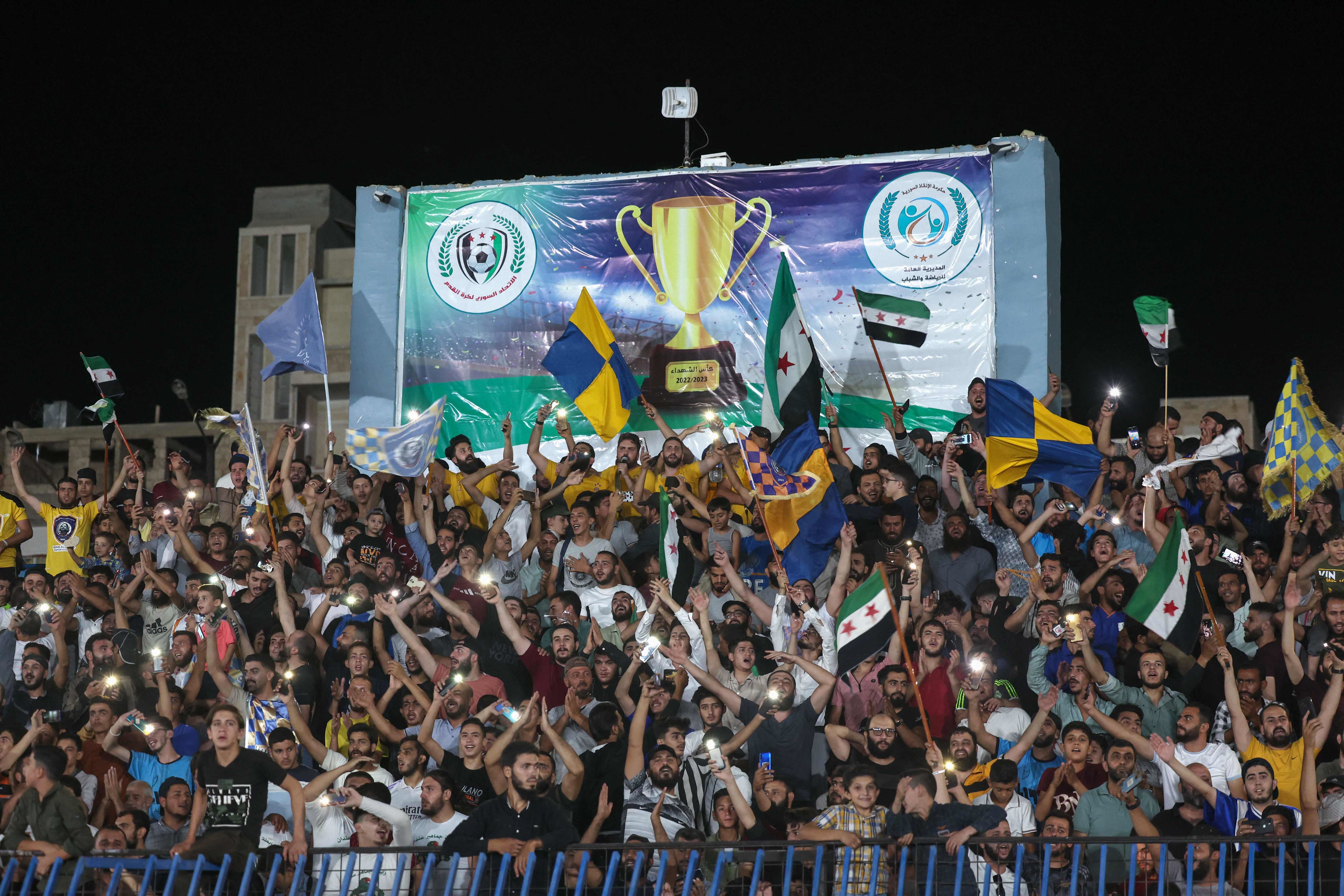 ليل الجمعة، حضر المباراة الختامية لبطولة "كأس الشهداء"، التي شارك فيها 36 فريقا محلياً من مناطق خارجة عن سيطرة الحكومة السورية، أكثر من عشرة آلاف متفرّج، ضاق بهم استاد إدلب الرياضي.