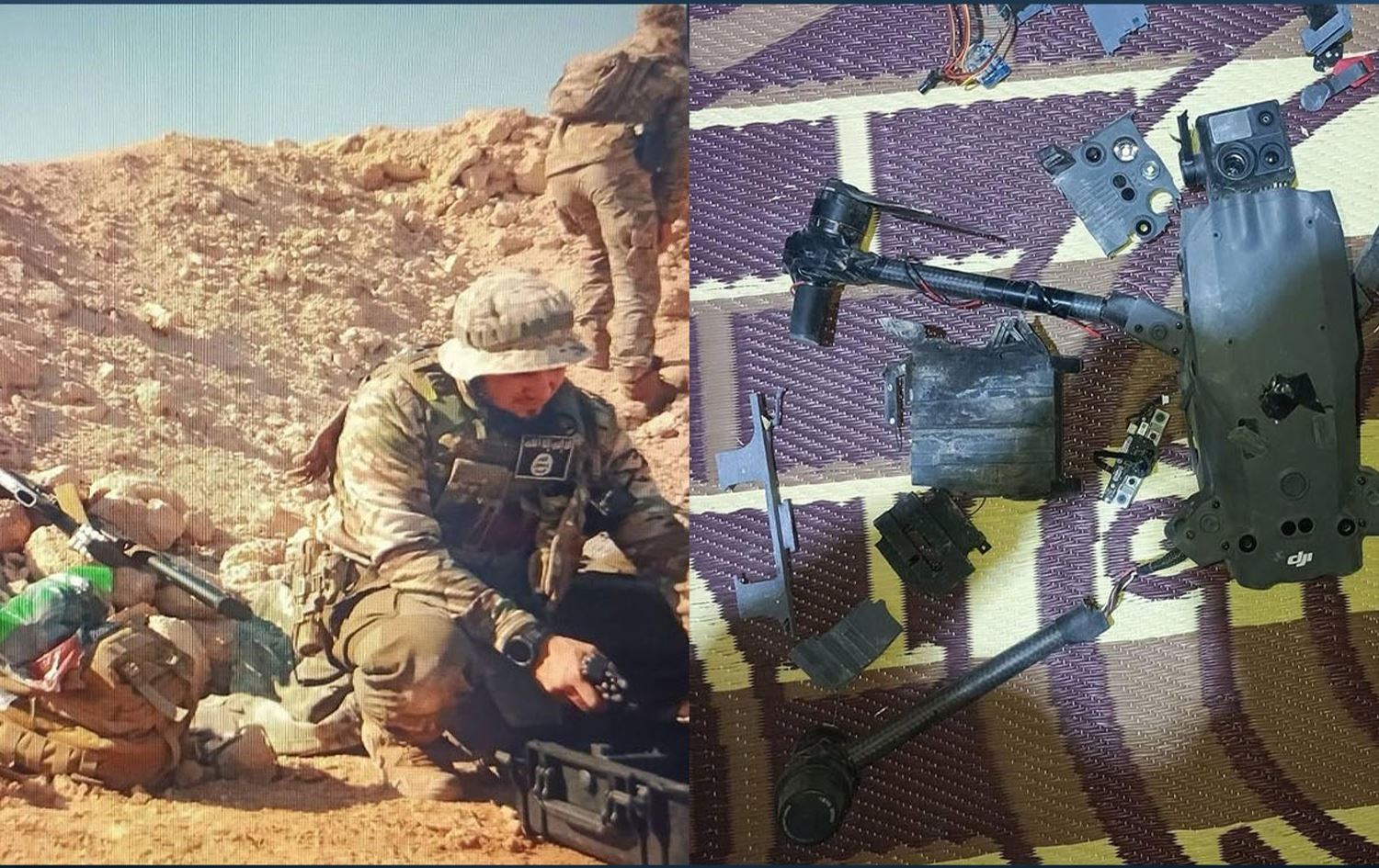 صورة لعنصر من (داعش) يستعد لشنّ الهجوم إلى جانب صورة للطائرة المسيّرة التي أُسقطتها قسد - الصورة من موقع قسد