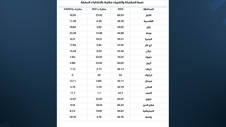 وفقاً للنتائج المعلنة، ومقارنة مع انتخابات مجالس المحافظات 2023 وبرلمان كوردستان 2024، ارتفعت نسبة التصويت بشكل عام بنسبة 8.39%، أما وفقاً لانتخابات 2021 كانت تلك النسبة في عموم العراق 11.60%.