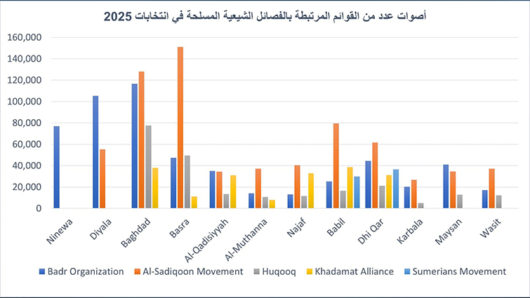 الفصائل المسلحة الشيعية، باستثناء (المنتصرون) التابعة لكتائب سيد الشهداء التي شاركت في تحالف نوري المالكي، وباستثناء فالح الفياض الذي كان مع تحالف السوداني، حصلت إجمالاً على 1,729,566 صوتاً في 12 محافظة. وفقاً للنتائج وبعد مقاطعة الصدر، بقي جنوب العراق معقلاً للفصائل المسلحة. ففي مكان كالبصرة، حصلت أربعة فصائل: صادقون، وبدر، وحقوق (قريبة من حزب الله)، وخدمات (كتائب الإمام علي) على 258,823 صوتاً، أي حوالي 16% من أصوات المحافظة، وكان صادقون في المقدمة، بأكثر من 150 ألف صوت. في مكان مثل ديالى التي لها أهميتها كممر للحركة العسكرية للفصائل المسلحة، حصلت بدر وصادقون معاً على 15.38% من أصوات المحافظة. أثبت السومريون القريب من كتائب جند الإمام موقعه في ذي قار وبابل، لكن حقوق حققت موقعاً أقوى في جميع محافظات الجنوب العشر.
