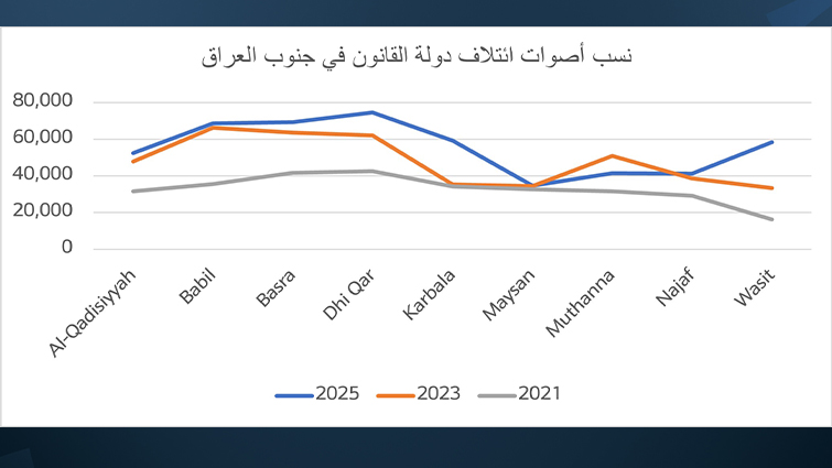 قائمة دولة القانون، عند مقارنة نتائج الانتخابات الثلاث 2021، 2023 و2025، حافظت على موقعها التقليدي في محافظات ذي قار، وبابل، وواسط، وكربلاء، وزادت أصواتها في معظم جنوب العراق باستثناء المثنى. لذلك يمكن أن يعدّ نفسه فائزاً أيضاً، لكن العقبة الكبرى هي زيادة منافسيه. في 2021 كان الصدريون والفتح منافسين له، وفي 2023 تحالف نبني، الآن يمتد المنافسون من تحالف السوداني إلى عصائب أهل الحق، ولديه منافسون في معظم الأماكن وفي معظم محافظات الجنوب لديه تنافس قريب مع ثلاث مجموعات على الأقل.